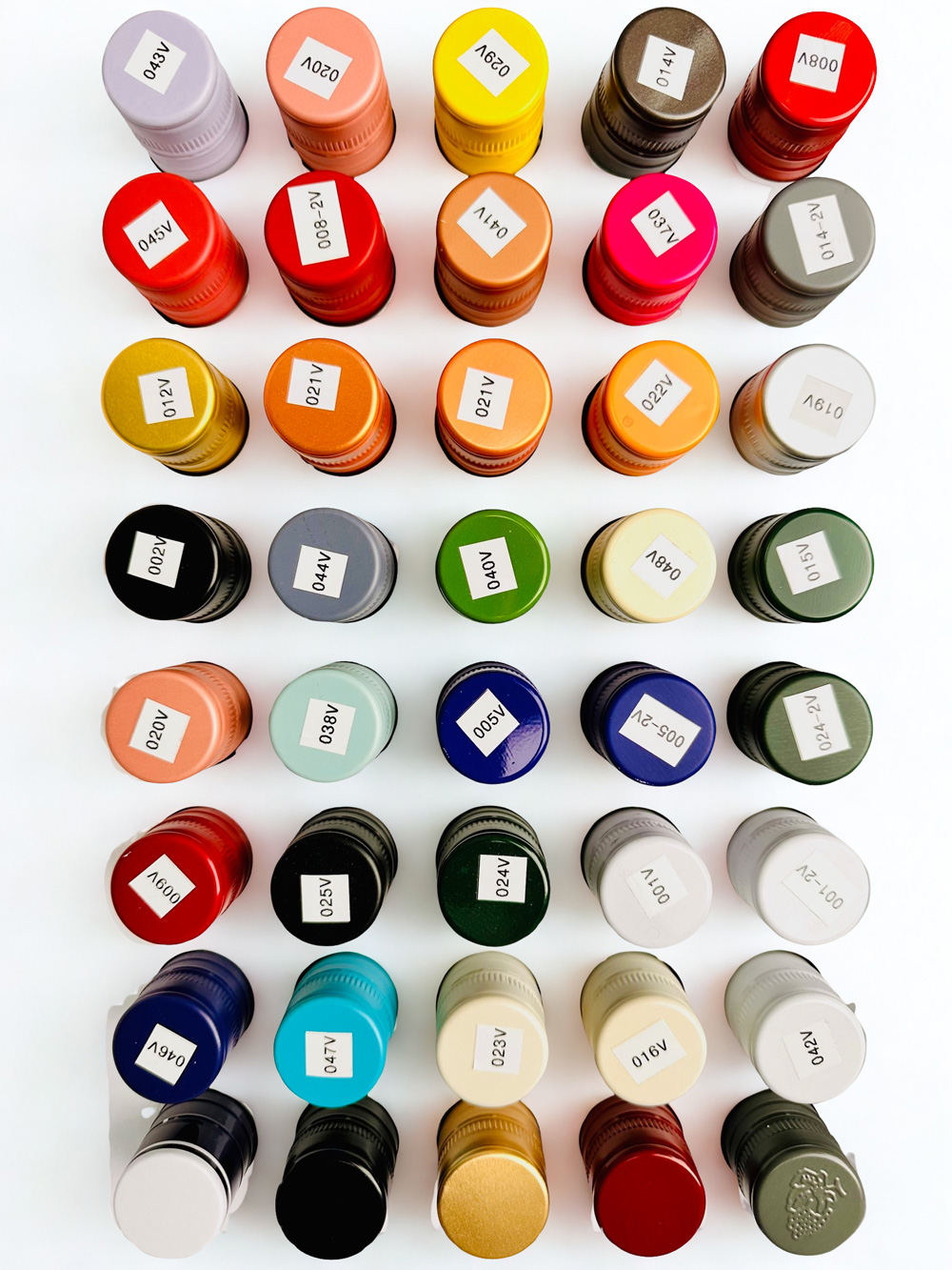 We have standard colours available for screwcaps: Black, White, Silver, Gold, Yellow, Orange, Red, Green, Blue, Grey (see colours on the picture right).